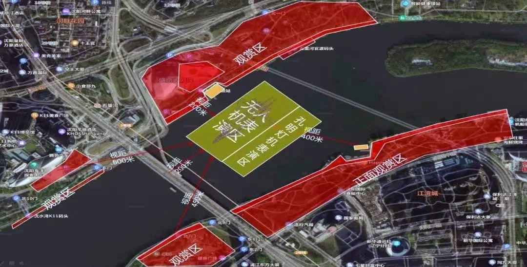 无人机表演位置位于盛京大剧院南侧河面上空,浑河两岸均可观赏。根据无人机空中图像位置和高度,建议观赏区域如下:1. 浑河南岸由浑河大桥以东至南洋码头区间;2. 浑河北岸由浑河大桥以东至秦开像南面的观景台区间;3. 浑河大桥以西南北两岸距浑河大桥500米以内区间。