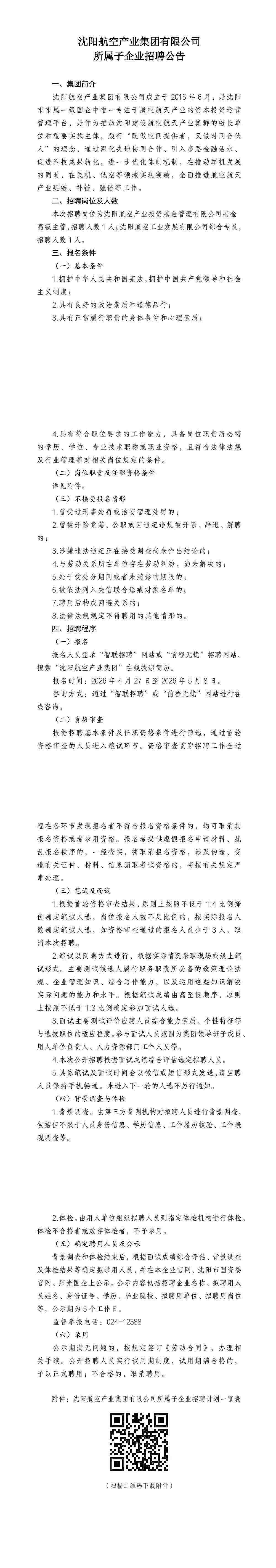 沈阳航空产业集团有限公司所属子企业招聘公告